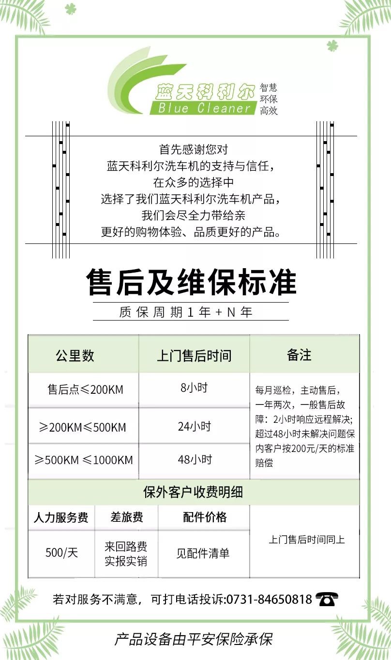 綜上所述:藍天科利爾洗車機是華中地區(qū)唯一的一家生產(chǎn)、銷售、售后一體的公司。在物流、安裝、售后等方面可以快速的響應,有非常好的區(qū)位優(yōu)勢。藍天科利爾全系列洗車機由平安保險承保(詳見下圖售后及維保標準)